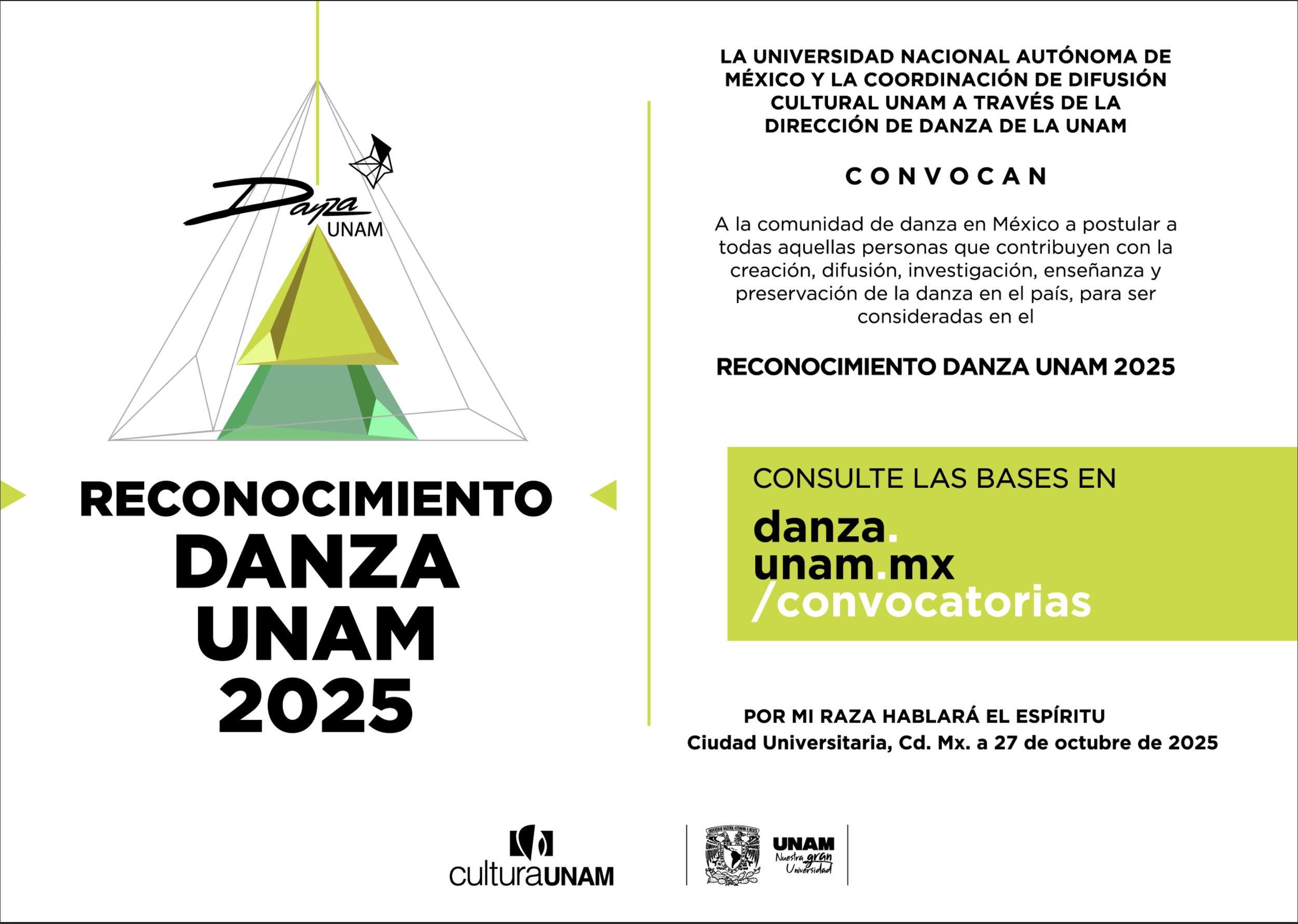 La Universidad Nacional Autónoma de México y la Coordinación de Difusión Cultural de la UNAM a través de la Dirección de Danza de la UNAM, convocan a la comunidad de danza en México a postular a todas aquellas personas que contribuyen con la creación, difusión, investigación, enseñanza y preservación de la danza en el país, para ser consideradas en el