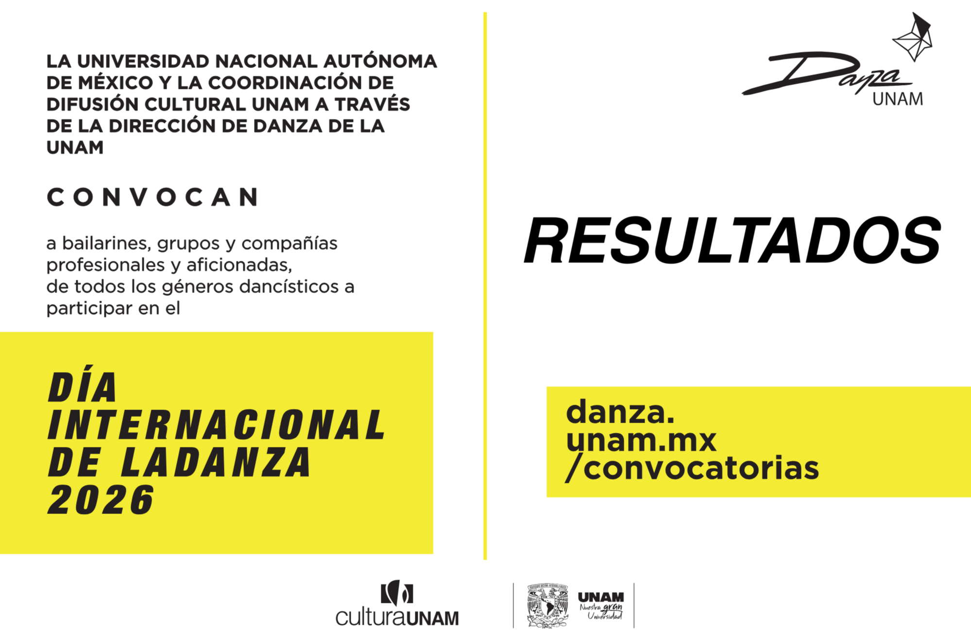 La Universidad Nacional Autónoma de México a través de la Coordinación de Difusión Cultural y la Dirección de Danza, convocan a bailarines, grupos y compañías profesionales y aficionadas, de todos los géneros dancísticos a participar en el DÍA INTERNACIONAL DE LA DANZA 2026